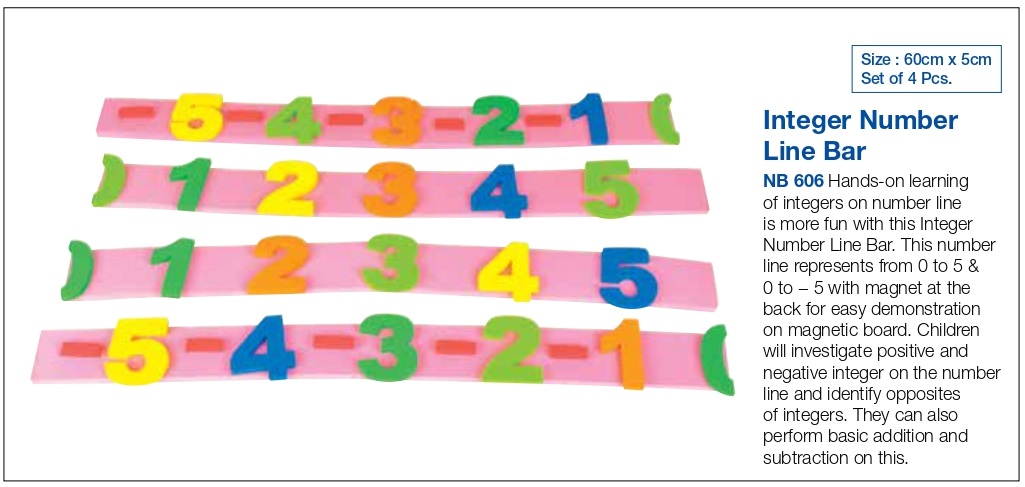 Hands on learning of integers on number line is more fun with this integer Number Line Bar. This number line represents from 0 to 5 & 0 to -5 with magnet at the back for easy demonstration on magnetic board.